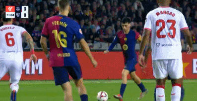 第28分钟,亚马尔突入禁区内右侧,左脚外脚背分球弧顶位置,佩德里右脚直接轰出世界波!巴萨2-0塞维利亚。