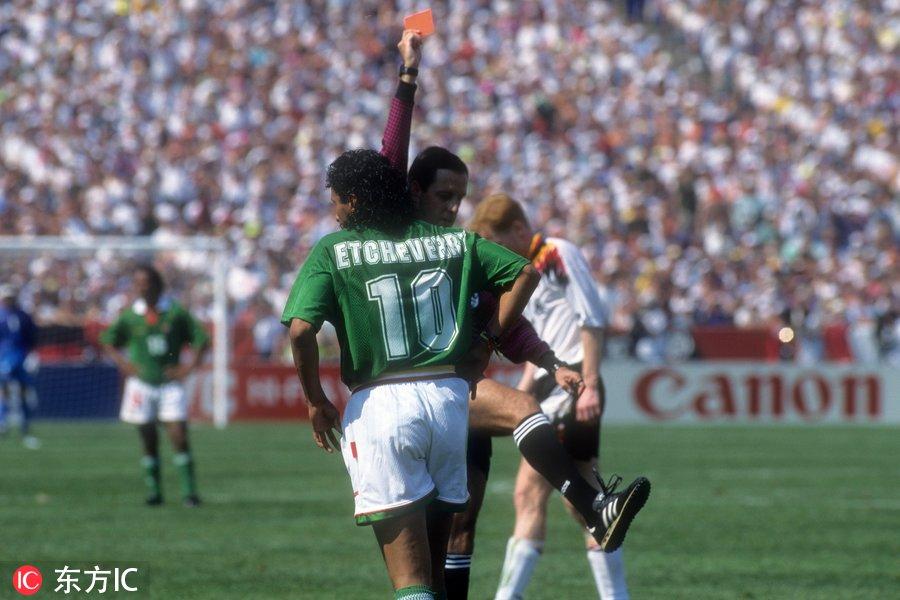 德国队通过布特的防守来阻止乌拉圭队的进攻。弗莱助跑,准备踢一个落叶球。这个球的落叶弧线已经出来了,但是稍微高了一些,我们可以看到布特防守的半边球门,厄切尔将踢这个球。