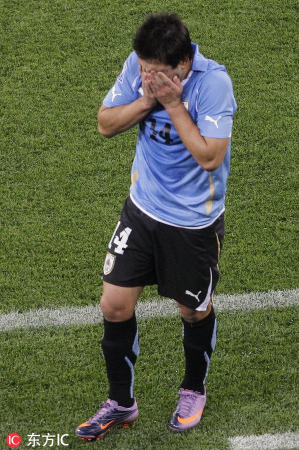 苏亚雷斯停球转身射门,可惜球没有命中目标。弗兰准备头球攻门,但是面前突然出现了一个黑影,乌拉圭队罚了一个低球,这是一个危险的信号。