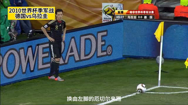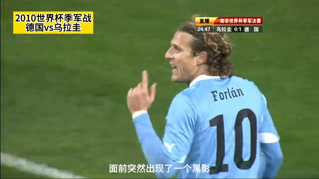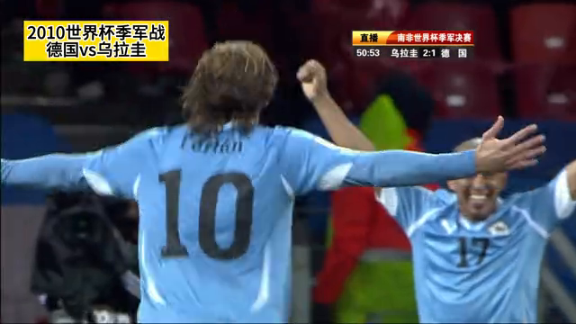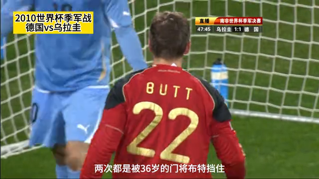 2010年世界杯季军战在南非伊丽莎白港的纳尔逊曼德拉海湾球场举行,德国队对阵乌拉圭队。比赛进行到第76分钟,弗兰的射门击中横梁,最终德国队以1-1战平乌拉圭队,双方进入加时赛。弗兰在比赛结束前的最后时刻错过了个人的第五或第六个世界杯进球,距离他的梦想仅差几厘米。中央电视台的观众朋友们,欢迎您收看这场比赛。乌拉圭队希望从德国队手中夺得本届世界杯的第三名,他们穿着天蓝色球衣。德国队则穿着黑色球衣,准备迎战对手。镜头对准了布特,他准备应对乌拉圭队的进攻。