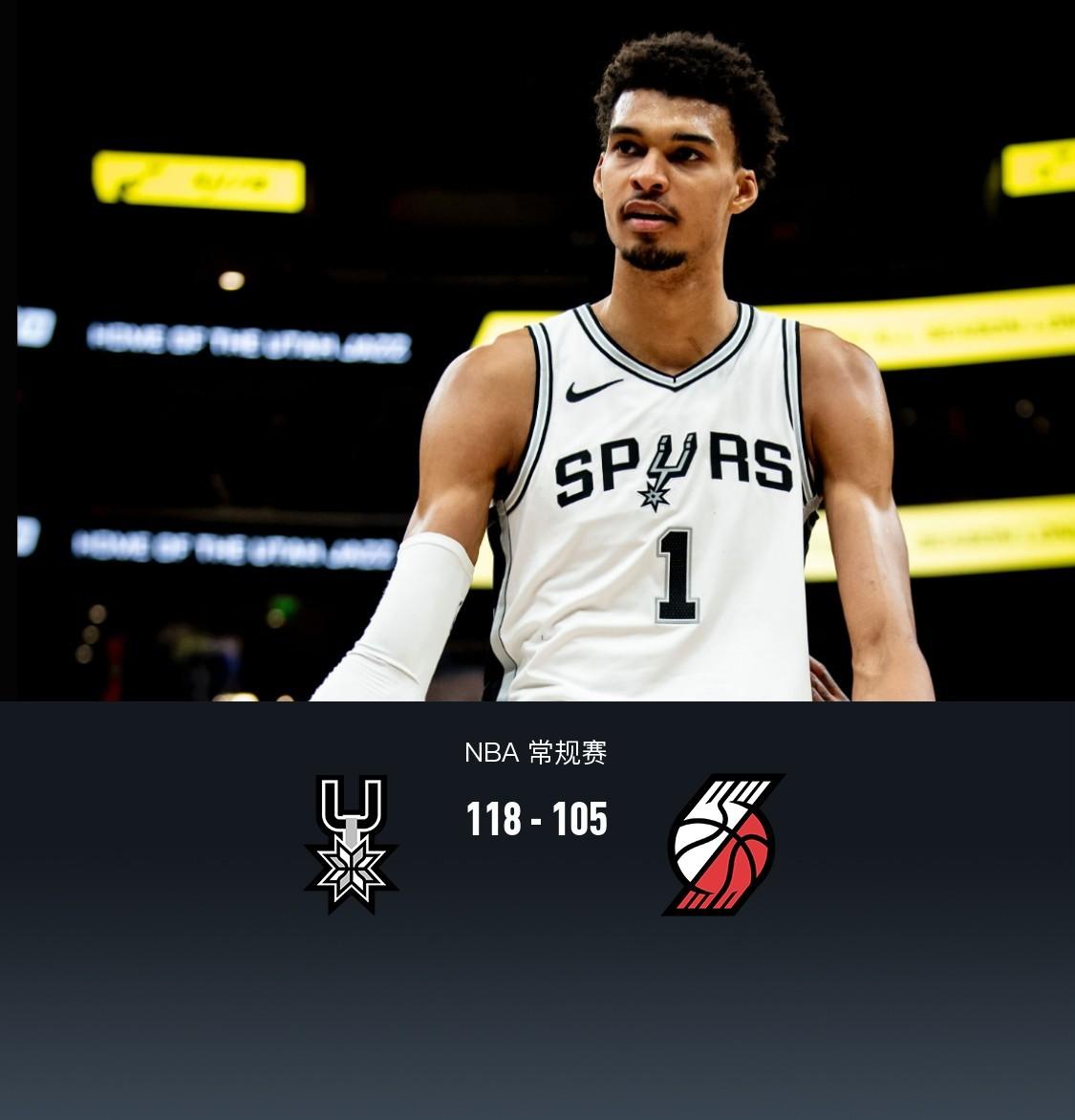 第四节马刺斯蒂芬-卡斯尔拿下8分,开拓者安芬尼-西蒙斯拿下7分,最终马刺118-105战胜开拓者