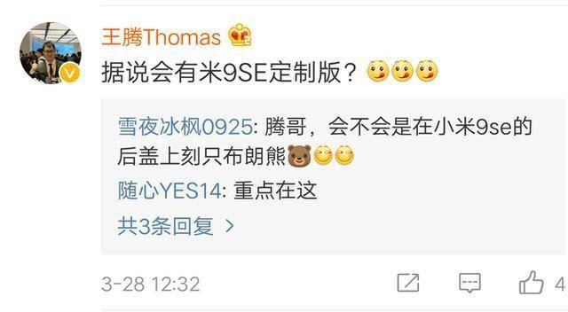 前天刚预热完王源定制版小米9,昨天中午又有一则消息爆出,小米公司产品总监王腾Thomas发布微博称,小米9 SE会有“布朗熊”定制版,随后秒删,不过还是被细心的网友截图到了。随后王腾改口称“据说会有好事发生。”
