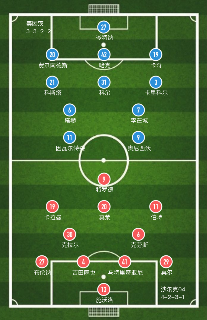 沙尔克04(4-2-3-1): 13-施沃洛,27-布伦纳(89' 23-艾丁),4-吉田麻也,41-马特里奇亚尼,29-莫尔,30-克拉尔,6-克劳斯,19-卡拉曼(72' 8-拉察),20-莫莱(46' 24-德雷克斯勒),11-伯特,9-特罗德(84' 40-波尔特)