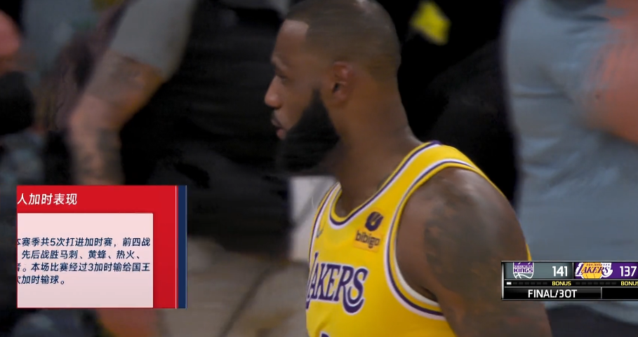 一直到末节最后5分钟,其实国王还87:93落后于湖人,接下来他们疯狂追分,伴随着莱恩的三分命中,国王完成大逆转。而且在第4节后半段国王打出了一波21:7的超级反扑,不过最后的一分半钟时间,湖人也不放弃还在追分,末节来到一分钟以内,先是詹姆斯的上篮命中帮助湖人反超两分,福克斯反击上篮21.7秒,双方打成100平,最后一次詹皇的关键超远压哨三分不中,两边先进入了加时赛。