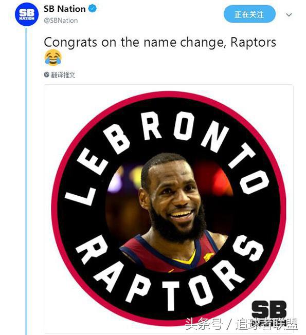 SB Nation专门制图调侃: LeBronto Rapors(勒布朗多猛龙)