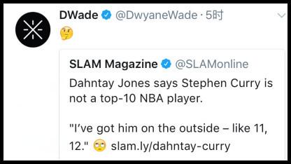 韦德转发了这条推特并发布了一个思考的表情,侧面证明了就连詹姆斯的至交好友韦德都不赞同邓台-琼斯的想法,邓台-琼斯这次真的闹了天大的笑话,中立的球迷也发出了自己心目中的联盟前十巨星榜单,说库里必然是联盟前十巨星!