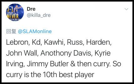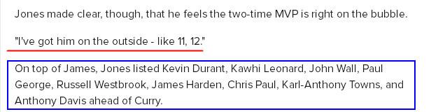 当邓台-琼斯被问道他会将库里排在什么位置?邓台回到排在联盟第11和第12,而且他还排出了自己心目中联盟前十球员的名字:詹姆斯、杜兰特、科怀-伦纳德、约翰-沃尔、保罗-乔治、威斯布鲁克、哈登、克里斯-保罗、唐斯、安东尼-戴维斯,这十名巨星,他们都在库里之前,就连才打了新秀第二赛季的唐斯都能排在库里之前?这份榜单就连韦德都发出了质疑。