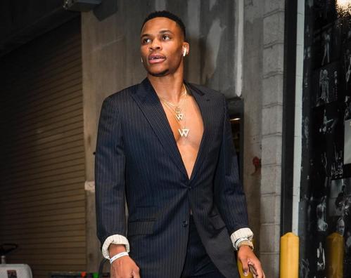 而威少的西装穿搭同样标新立异,一般来说,西装的外套里面至少要穿一个衬衣打底,但是威少却直接“裸体真空”穿西服的外套,威少如此穿搭是要秀他大块的胸肌吗?