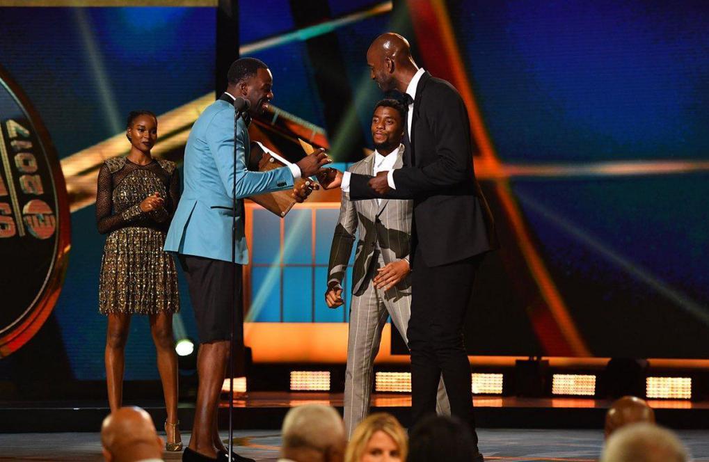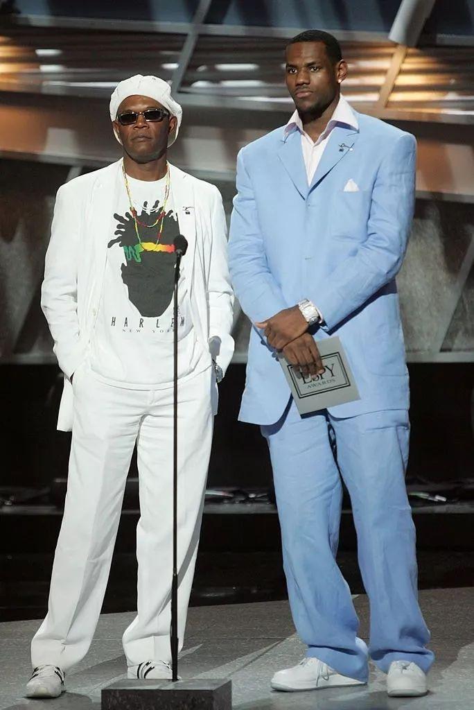 还有 04年,詹姆斯在 ESPY Award 颁奖典礼上,穿的一套浅蓝色西装配淡粉红色恤衫,这一套简直可以说黑历史般存在。