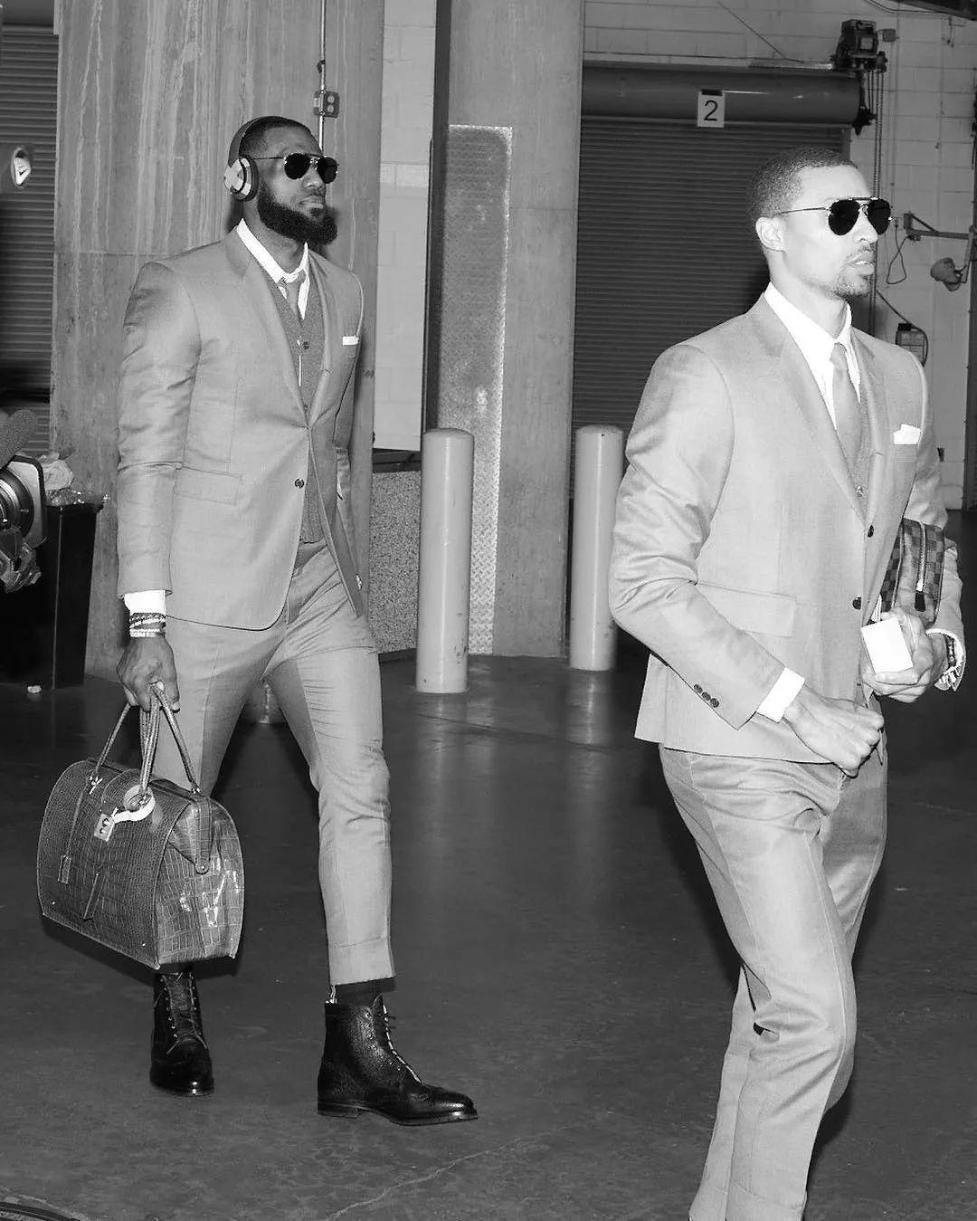 在之前一场比赛前,詹姆斯为鼓舞士气曾经为全队定做一套西服,统一穿着出场。而走在最前面的詹姆斯霸气十足,不得不说,詹姆斯穿上西装简直太帅了。