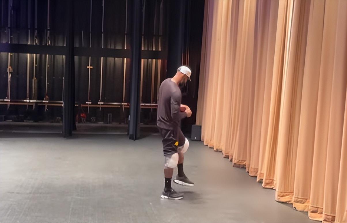 视频中,刚结束训练的詹姆斯躲在舞台的幕布后,当幕布拉开时,詹姆斯出现在学生们面前。瞬间,全场欢声雷动,学生们纷纷起立欢呼,足见詹姆斯的人气。詹姆斯的双膝都绑着厚厚的冰袋。