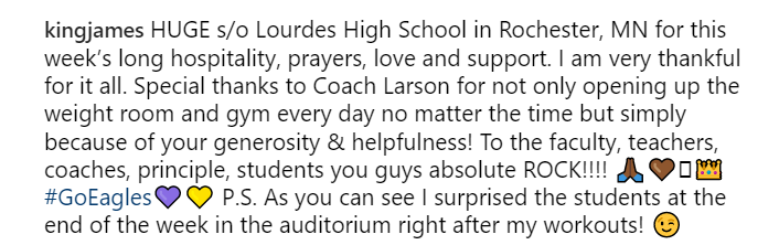 詹姆斯写道:“感谢明尼苏达州罗切斯特市卢尔德高中本周热情的款待、爱和支持。我非常感谢这一切。在此,我要为拉尔森教练送上特别的感谢,无论什么时候,他都为我开放了健身房和训练场,感谢你的慷慨和帮助!致全体员工、老师、教练、校长、学生们!你们真的棒极了!??????PS正如各位在视频中所看到的,我在训练结束后在礼堂内给学生们送上了一份惊喜!?”