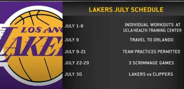 湖人的7月日程已经出炉,他们在北京时间7月2日至9日进行个人训练,7月10日出发前往奥兰多,7月10日至22日进行全队合练,7月23日至30日进行三场热身赛,7月31日,他们将迎来复赛后的第一场正式比赛,对手是洛杉矶快船。