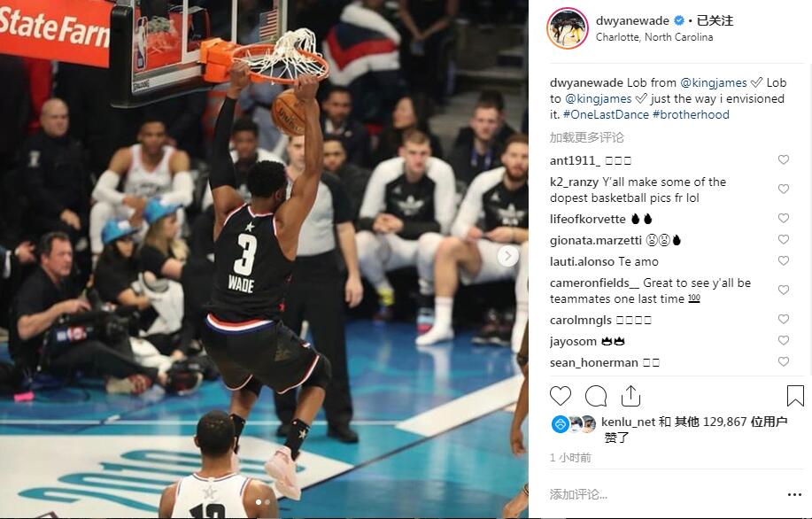 对于最后一届全明星,韦德还写道:“开心!心怀感激!13次全明星之旅。”