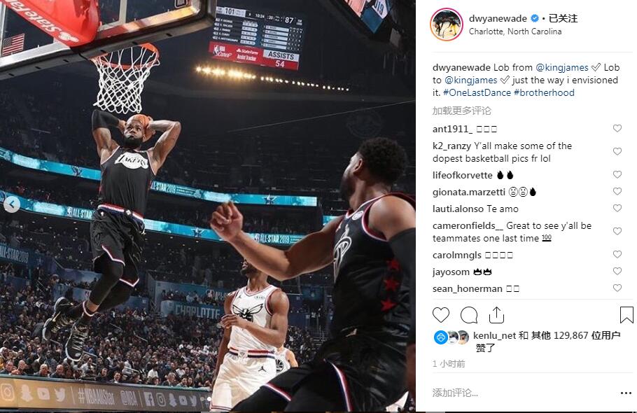 赛后韦德在ins上晒出了这两张照片,写道:“接詹姆斯传球空接&给他传球空接,这和我预想的一样。#最后一舞#兄弟情”