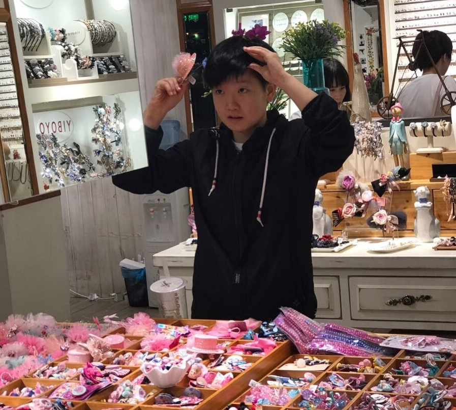 孙颖莎给大家的印象就是一头英姿飒爽的短发,干练、凶猛。可走进女孩们喜欢的粉色饰品店,孙颖莎也迈不开腿了,拿起一个很好看的粉色发夹,就往自己的头上戴。这国乒美少女,也有一个长发公主梦啊。可是,头发真的太短,最后孙颖莎只好无奈地取下粉色发夹......