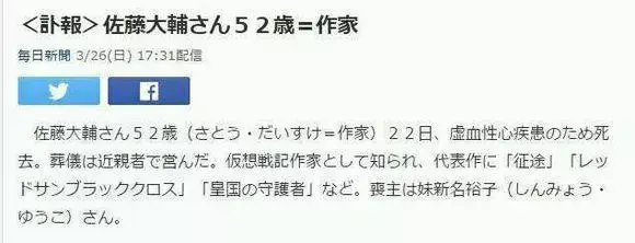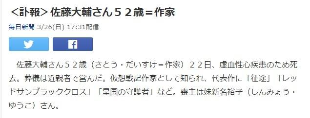 根据日媒最新消息,漫画《学园默示录》的原作者佐藤大辅因病去世,享年52岁。