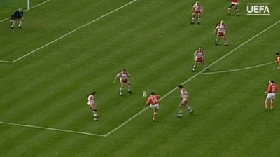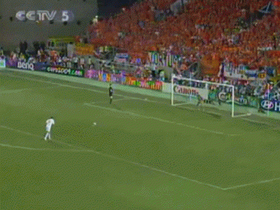 第54 分钟,欧洲杯历史上最精彩的进球诞生了! 在穆伦左路将球传出后,球似乎有些偏向后点,但范巴斯滕做出了一个天才的举动,他在极小的角度右脚垫射,越过了达萨耶夫的十指关,荷兰队2-0领先!