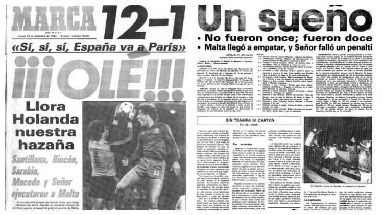 1980年欧洲杯,荷兰队止步小组赛。随后,荷兰队连续缺席了三届大赛。1984年欧洲杯预选赛,当荷兰队率先完赛时,他们的成绩是13分净胜球+16,晚一天开球的西班牙队净胜球+5,他们以12-1战胜马耳他,最终靠进球数优势挤掉荷兰队晋级欧洲杯。