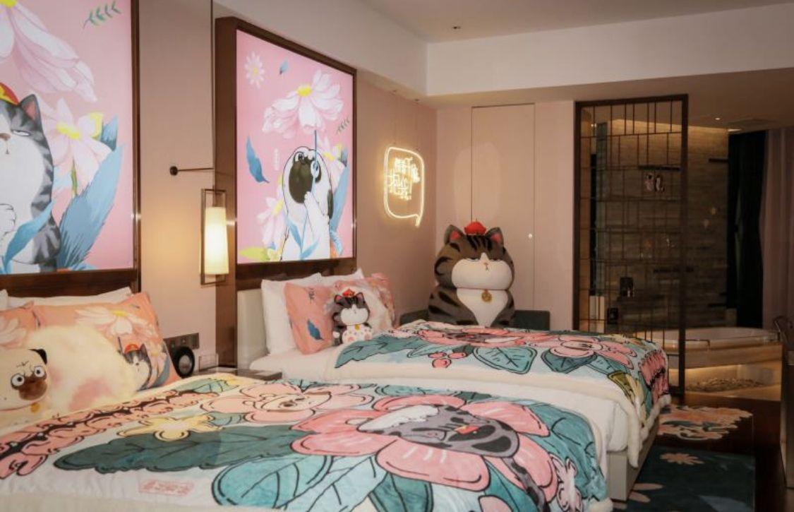 建议家庭入住“吾皇万睡”IP主题房,一款是“花花世界”主题客房,进门就被处处可见的大懒猫“吾皇”吸引住,有一只巨大的“吾皇”猫玩偶慵懒地躺在角落里“求抱抱”,瞬间就吸引住了小朋友的心。另一款是“钦赐好梦”主题客房,主色调为柔和的暖紫色。推开门,映入眼帘的是悬浮在空中的月亮、云朵、小星球,打造出极具浪漫色彩的夜空。