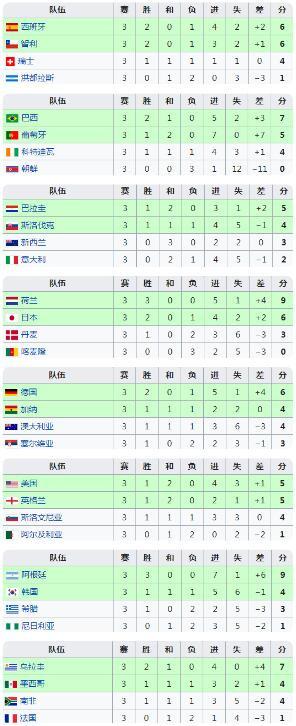 第一场:西班牙0:1瑞士,第二场:西班牙2:0洪都拉斯,第三场:西班牙2:1智利。