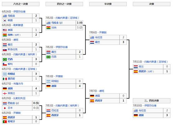在淘汰赛中,西班牙队用3个经济实用的1比0进入到了决赛。首先在1/8决赛中,西班牙与他的伊比利亚半岛对手葡萄牙相遇,双方也是经历了极其激烈的90分钟,最终又是比利亚打入制胜进球。而在巴拉圭的八强战中,巴拉圭顽强的属性一度令西班牙很头疼,但此时比利亚再一次挺身而出83分钟绝杀巴拉圭。