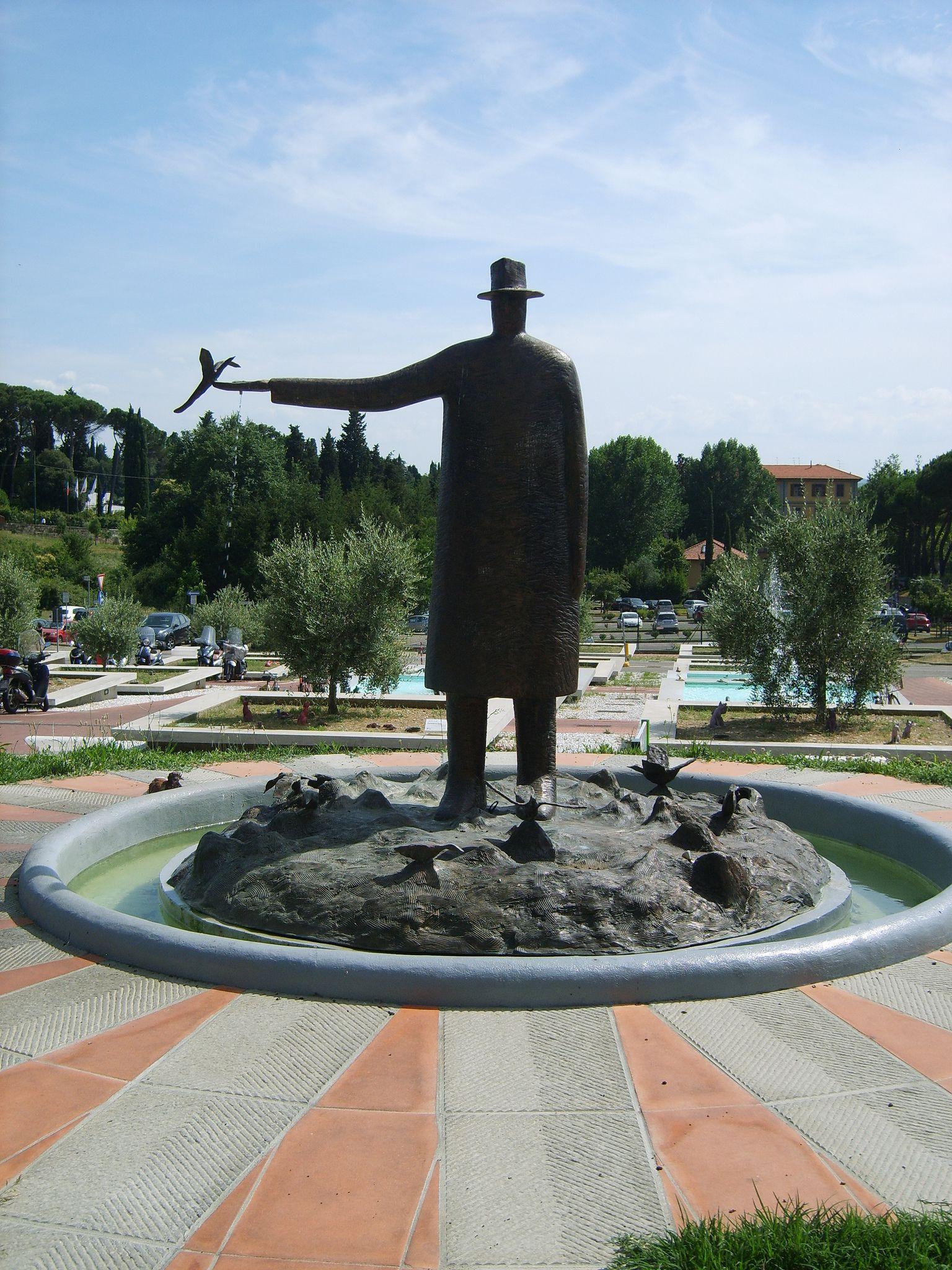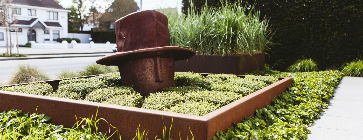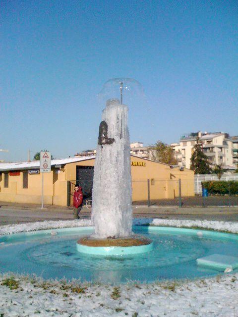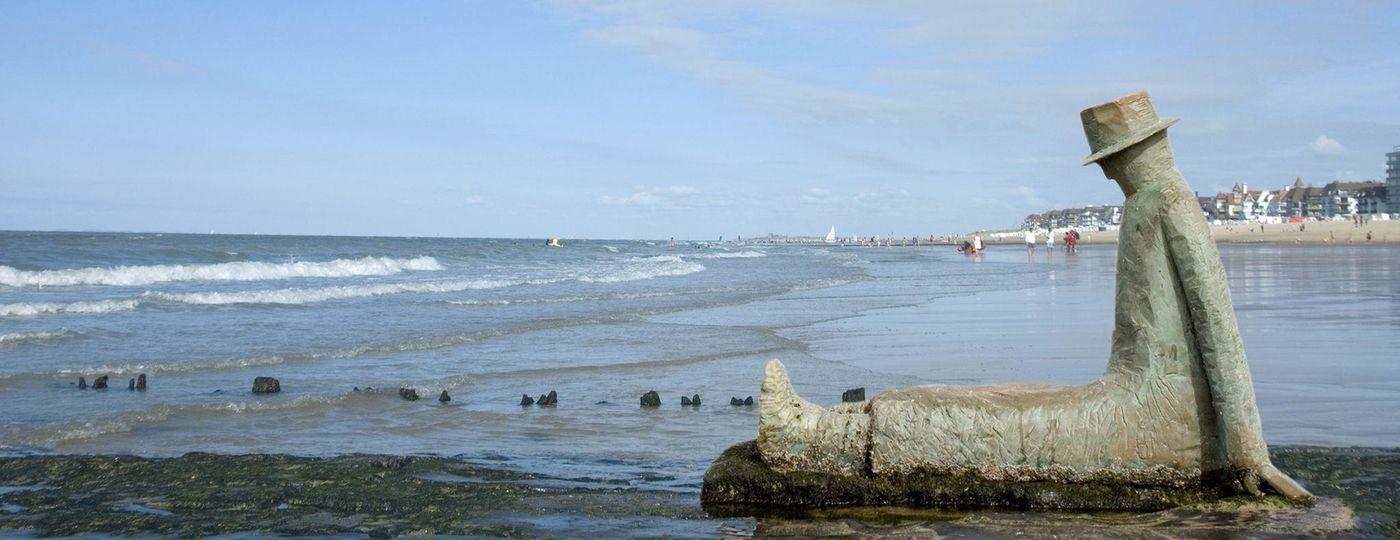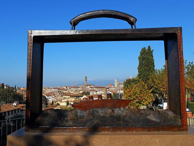 弗隆的雕塑和其绘画作品的风格一脉相承。坐在比利时克诺克(Knokke)一处防波堤上的《海》(La mer)是他惯常表现的带礼帽的人物形象。这位绅士安静地“欣赏”着美丽宁静的比利时海滩。《海》被作者赋予了时间因素,因为随着潮起潮落,雕塑会被海水覆盖又完全露出来。这种互动关系让观众免不了去设想,他在关注着什么,又或是在等待谁?弗隆的《华丽移动》(Magnifique Mobile)同样表现了头戴礼帽的人物形象。人物双手握住梯子的顶端,手臂因为电力而可以运动,雕塑因此可以变换不同姿势,好似在表演杂技的演员。当在幽暗的环境中展出时,配合上点点星光,显得非常诗意。《雨》(La pluie )也是一件经典作品。青铜人物塑像与喷泉相结合,恰似一个举着雨伞的人。虽然打着“伞”,人物还是会不断被淋湿,着给雕塑平添了一份诙谐。到了冬天,如果管理员忘记关掉喷水装置,这尊雕塑还会被冰包裹,变成一尊实打实的“冰人”。除了给自己的作品中赋予时间含义,弗隆还有不少雕塑作品借用所处环境,把空间性发挥到极致,青铜雕塑《分别》(Partir)就是很好的例子。整件作品是用透雕形式完成的青铜老式手提旅行箱,箱子的中间是一艘在海上行驶的船舶,预示“离别”这个主题的同时把环境引入雕塑中来,让环境成为了雕塑的一部分。
