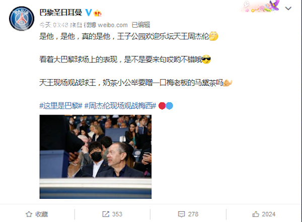 大巴黎的官方微博也欢迎了周杰伦:“是他,是他,真的是他,王子公园欢迎乐坛天王周杰伦。看着大巴黎球场上的表现,是不是要来句哎呦不错哦。天王现场观战球王,奶茶小公举要蹭一口煤老板的马黛茶吗?”