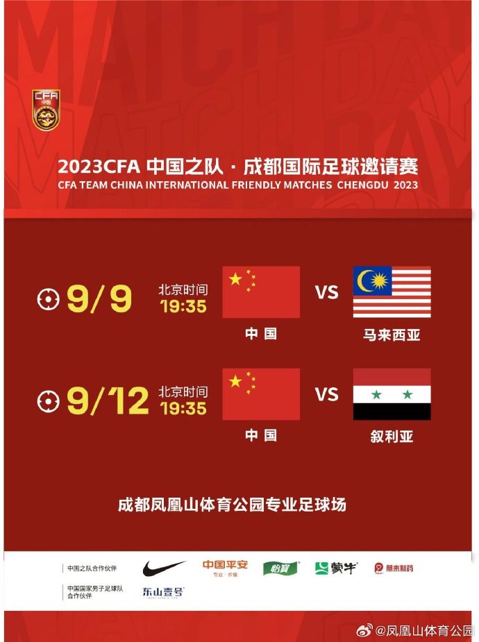 北京时间9月6日,成都凤凰山足球场官方账号公布了国足和马来西亚,以及国足和叙利亚的热身赛开球时间,2场比赛均在19点35开球,比赛日期分别是9月9日和9月12日。