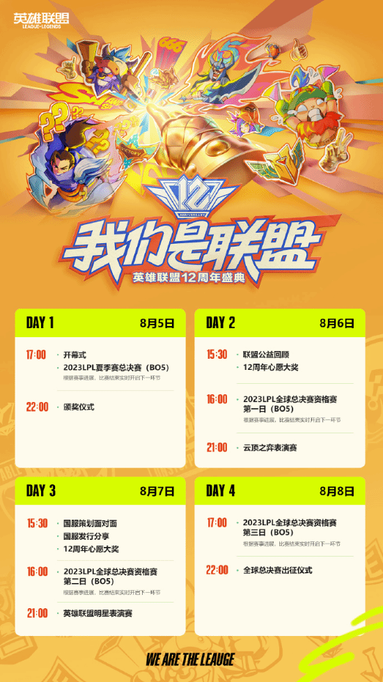 8月5日至8月8日,2023英雄联盟12周年盛典将在西安曲江竞技中心正式拉开帷幕。其中,2023LPL夏季赛总决赛将于8月5日打响,LPL赛区全球总决赛资格赛将于8月6日至8月8日上演。此外,在8月6日和8月7日,还有精彩的明星主播表演赛、更多的福利等内容。在所有比赛结束后,8月8日晚还将举行S13全球总决赛出征仪式。