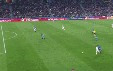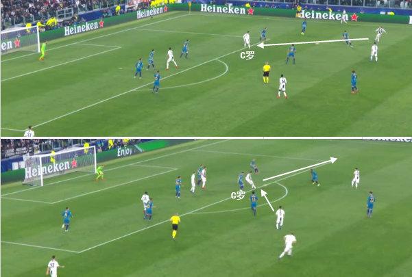 从上图上端我们可以看到,马竞在边路形成了多人的站位防守,目的就是不让尤文完成传中。但是,C罗在肋部的接应站位十分出色,可以在接球之后完成冲击(上图上端);另外,在进攻轮转中,C罗肋部的策应分边效果也同样明显。
