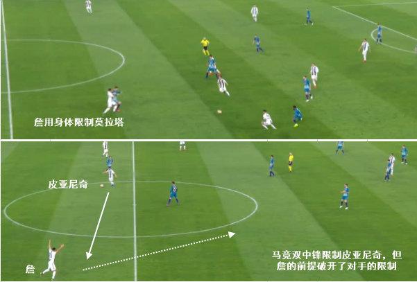 另一方面,詹在右中卫位置上的前提,可以避开马竞双前锋的逼抢,从而让尤文在边翼卫前提之后,让进攻端有一个持球推进的机动点,从而能更好地完成进攻组织。