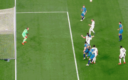 图5:C罗在肋部策应之后回到禁区抢点头球,皮球虽然被奥布拉克扑出,但整体已越过门线