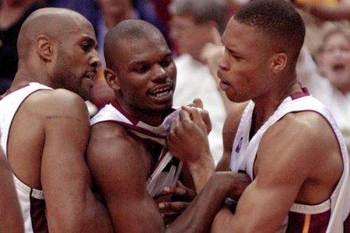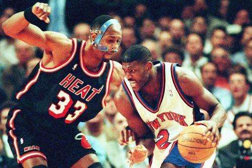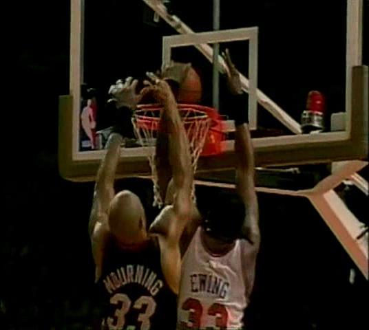 要说尼克斯和热火有着千丝万缕的联系也不为过。从教练说起,热火主教练帕特·莱利在1992-95年曾执教尼克斯,后来来到迈阿密后继续高举铁血防守大旗,把麾下的莫宁、马什本、布朗等一干猛男调教成为铁板一块的防守铁桶阵。反观尼克斯这边,继任者范甘迪深得莱利的防守精髓,在中流砥柱尤因渐老的情况下提拔年轻的坎比保护禁区,后场则由能冲善突的斯普瑞维尔和休斯顿担当攻击手。在1999-00赛季,纽约在防守端依旧是联盟顶级水平。除去教练的师生关系之外,尤因和莫宁也是乔治城大学的同门师兄弟,前者年长8岁,两人私交甚佳,但在赛场上可是毫不留情。尼克斯的拉里·约翰逊也曾经和莫宁同在黄蜂效力,加上同为前勇士队友,现为尼克斯主力的斯普瑞维尔和热火控卫的蒂姆·哈达威,两队可谓是知彼知己。