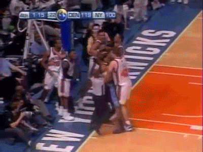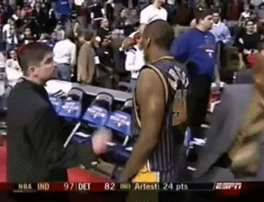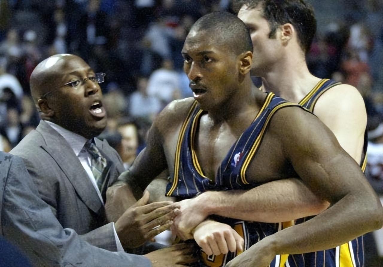 这是2004年步行者对阵活塞的一场常规赛比赛,这是两支强队之间的一场复仇战,因为上赛季的东部决赛,活塞在六场比赛中淘汰了步行者。在比赛的最后一分钟,步行者已经领先了15分,阿泰斯特在右侧三分线外出手,被华莱士犯规,并且被华莱士用手肘撞了一下。阿泰斯特随即倒地,并且躺在计分台上,似乎在冷静自己。然而,就在这时,一个观众从看台上扔了一个可乐杯,正好砸在了阿泰斯特的胸口。阿泰斯特立刻爆发了,并且冲入了观众席,试图找到那个扔杯子的人,并且殴打他。华莱士也跟着冲了过去,并且试图拉住阿泰斯特。其他的球员和教练们也纷纷加入了混战,场面一片混乱。最终,阿泰斯特和华莱士都被驱逐出场,并且受到了联盟的重罚。这件事也被称为“底特律骚乱”,是NBA历史上最严重的暴力事件之一。