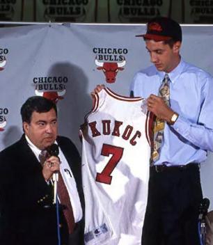 89年麦当劳公开赛,南斯拉夫纪念牌队在决赛与丹佛掘金交手,6分惜败。库科奇17分,21岁的他打得相当出彩,亮瞎克劳斯狗眼。天底下竟有这般人物,长得面如冠玉,一表人才,球技清新脱俗。眼见为实,于是90年公牛26号签,克劳斯选择了库科奇,在他心里库科奇就是比皮蓬靠谱的外线。尽管皮蓬也是克劳斯一手栽培的,但是皮蓬多次犯浑,让公牛王朝开启整整晚了两年。克劳斯身为总经理,对皮蓬拿捏不是一般的精准。只是多数情况下,碍于乔丹的强无敌,外强中干的皮蓬倒也得过且过。