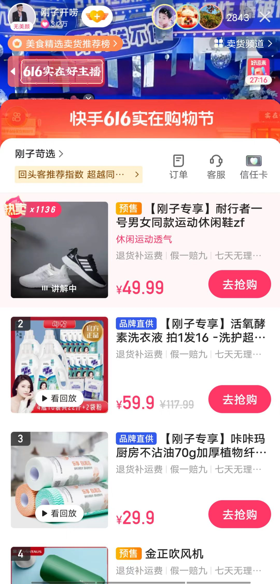 第三位刚子,刚子在节目中风趣幽默,表现极佳,深受百姓的喜爱,作为身高最高的主持人,给人一种亲和的感觉,而他也是在两个平台上面直播带货,物品也是物美价廉,很好用,我家的破壁机就是在直播间购买的,很不错。