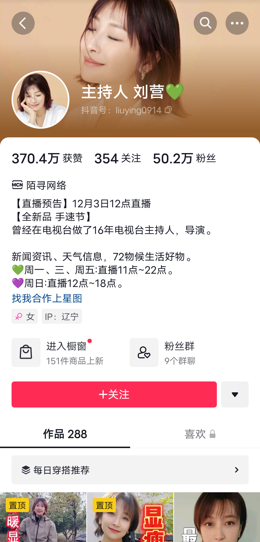 第二位刘营,刘营是天气预报主播,在辽台辞职后,也是在抖音平台做起来带货主播,物品多为家庭常用物品,物美价廉的那种,很实用,平时是周一、三、五11-22点直播,周日是12-18点直播,喜欢她的小伙伴不要错过哦。