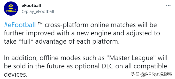 但前脚“免费”的噱头还没焐热,科乐美后脚又在官方推特上宣布,玩家如果想体验《实况足球》新作的大师联赛等本地模式,则需要额外付费购买单独的DLC。