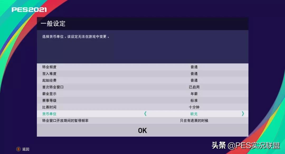 在正式组建球队之前,还需要进行相关内容的设定,初玩者可以根据自己的游戏水平随意调整转会频率和难度等,而为了增加游戏的真实性,笔者每次都会特别将货币单位改为欧元。