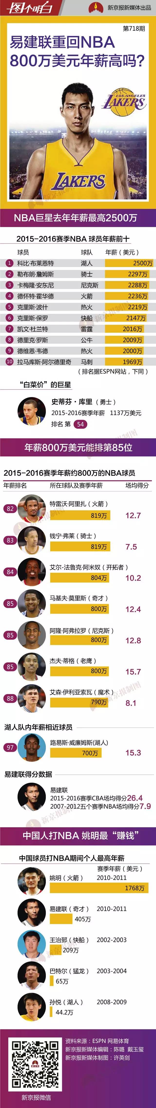 据新华社报道,易建联已经与洛杉矶湖人队签约,时隔4年将重返NBA赛场。此前有报道称,湖人给出的合同为期1年、总额114万美元,许多球迷都觉得太低。据悉,易建联在CBA广东队年薪就已达2000万元人民币。而据美国ESPN最新消息,湖人给出的合同总额约800万美元。