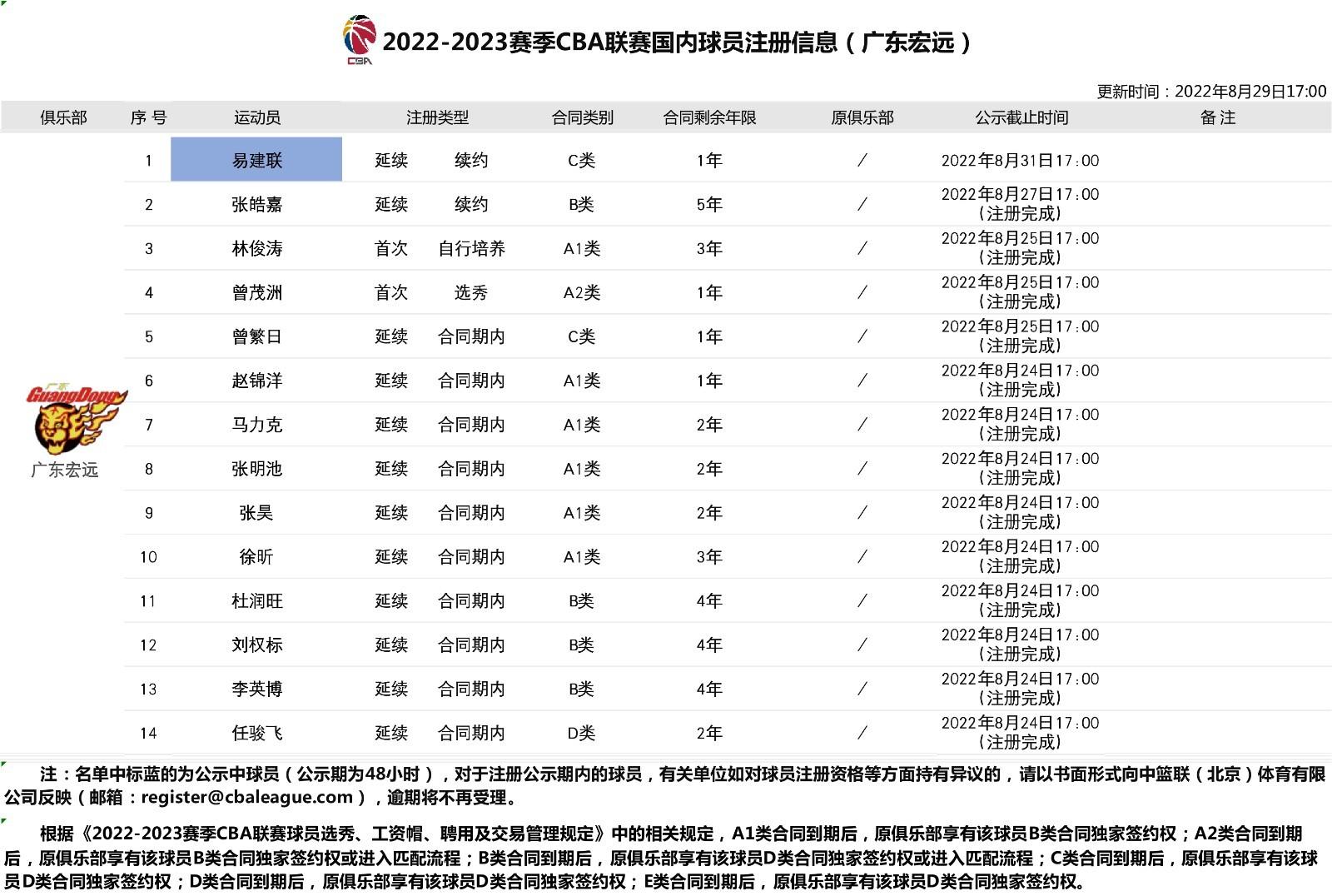 8月29日晚,CBA联盟更新2022-2023赛季国内球员注册信息,广东宏远的注册信息显示,易建联以C类合同续约一年。上个赛季易建联就是以C类合同与球队续约一年。而在2020-2021赛季,当时刚结束老合同的易建联选择与球队以D类合同续约一年。