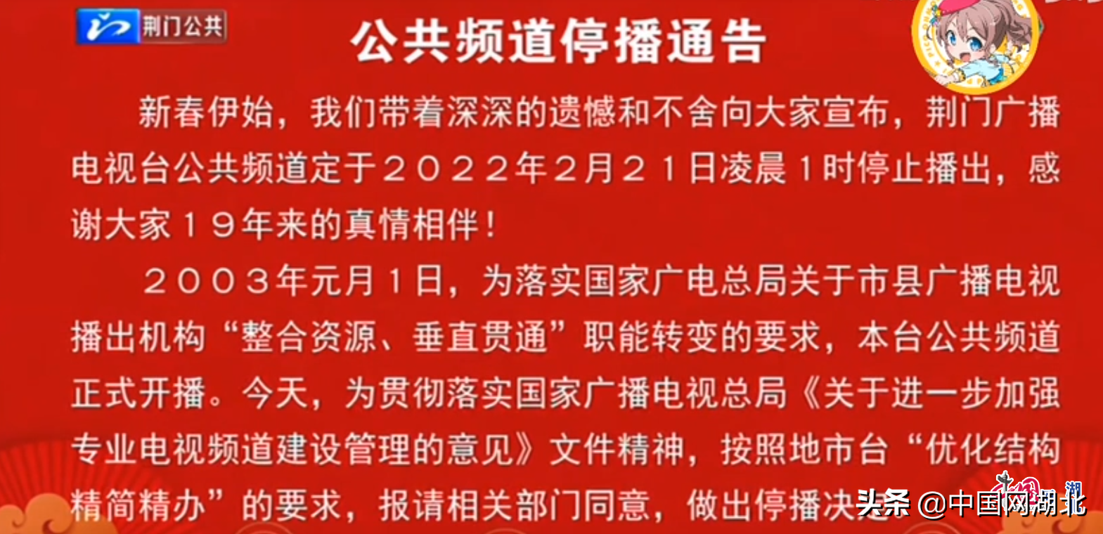 荆门广播电视台发布的《公共频道停播通告》称:2003年元月1日,为落实国家广电总局关于市县广播电视播出机构“整合资源、垂直贯通”职能转变的要求,本台公共频道正式开播。今天,为贯彻落实国家广播电视总局《关于进一步加强专业电视频道建设管理的意见》文件精神,按照地市台“优化结构,精简精办”的要求,报请相关部门同意,做出停播决定。