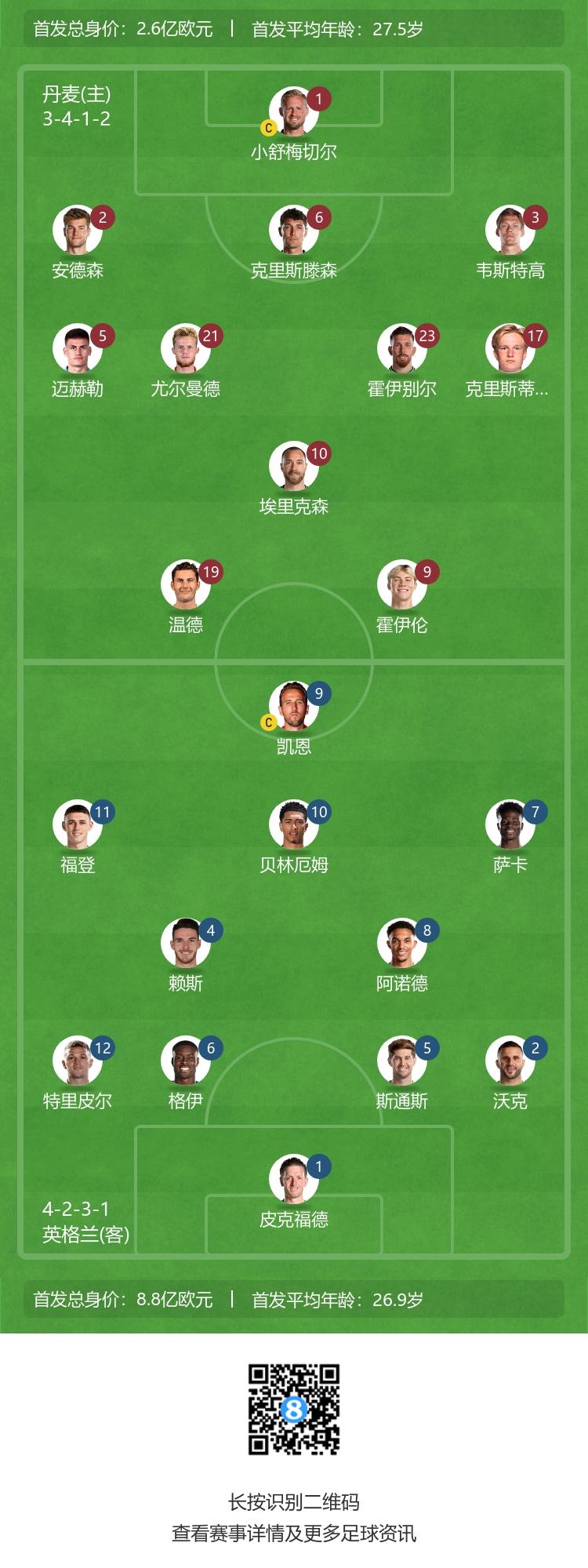 直播吧06月20日讯 北京时间0点,欧洲杯小组赛C组第2轮,丹麦vs英格兰的比赛将在法兰克福竞技场打响,赛前官方公布首发阵容。
