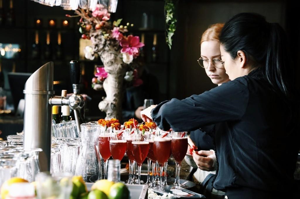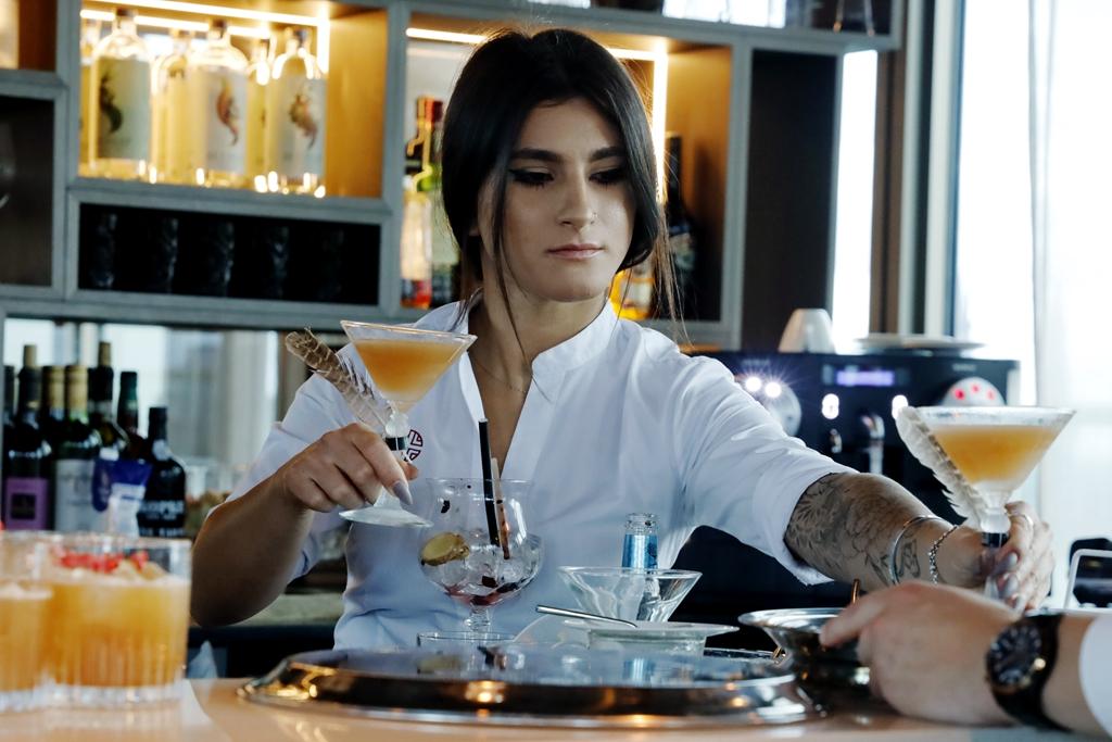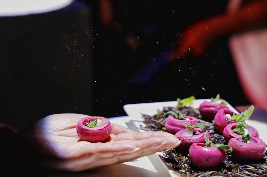 走进餐厅漂亮的女服务生端上开胃酒,将金箔喷洒在盛着鱼子酱的粉色甜点上,暗弱的灯光下,空气中弥漫着神秘浪漫的气氛。颇具仪式感的欢迎仪式后,每个人按餐桌上的号码找到自己的座位,就像走进飞机头等舱。