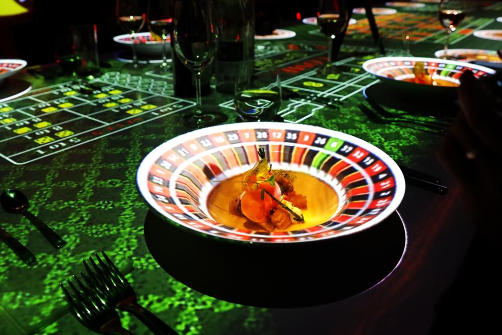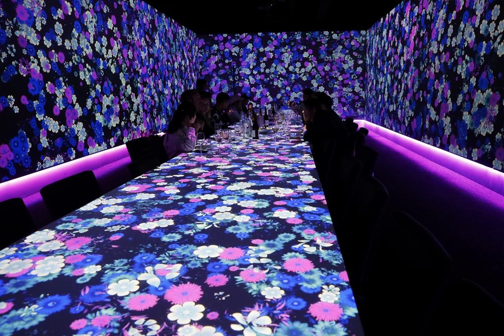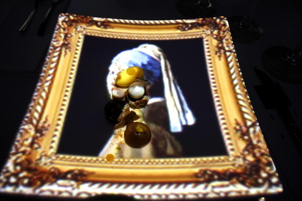 四周绚烂的灯光,将原本素色的长条餐桌映照得五彩缤纷,花团锦簇,非常梦幻。随着一道道精致美食上桌,3D投影在盘中的灯光大秀就开始了,从茁壮生长的可爱小蘑菇,到小时候玩的大嘴豆游戏,还有荷兰名画戴珍珠耳环的少女,都纷纷出现在餐桌,最后周边的墙上出现一系列荷兰历史上的著名画家,将盛宴推向了高潮。这场梦想和现实完美结合的大餐,绝对会颠覆你的想象。