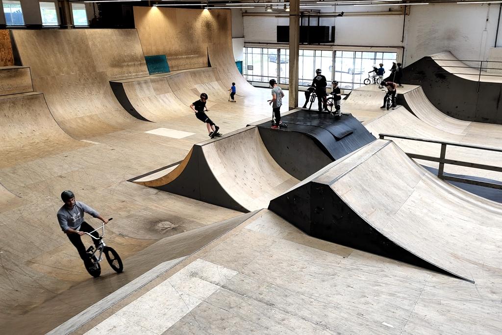 文创园中还有不少特色商户,很难一下子逛完,正逢周末,当地很多家庭陪孩子参加极限运动课程,几个篮球场大的旧厂房空间被改造成滑板、小轮车的训练场地,成为孩子们的乐园。