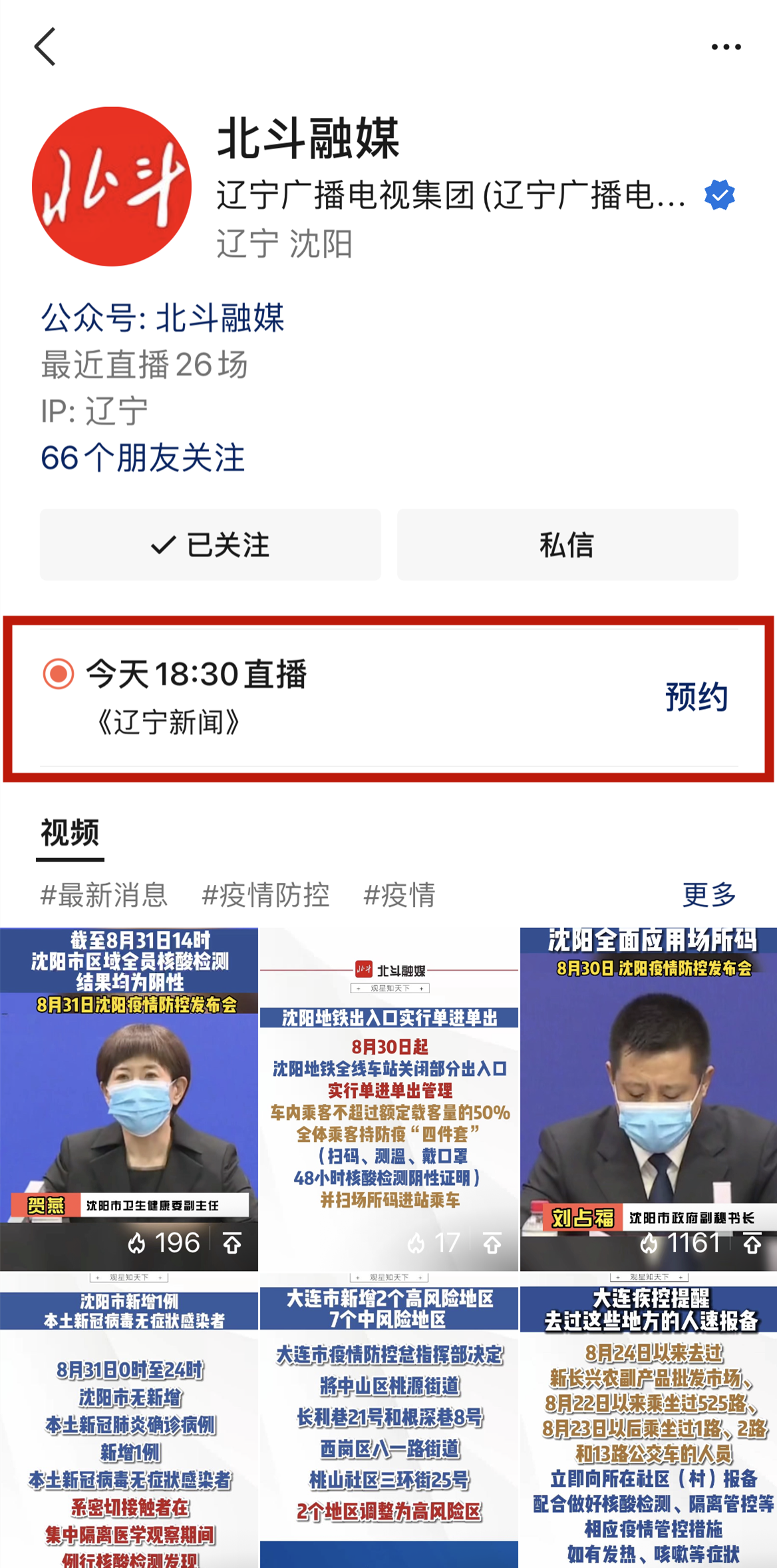 2、请点击“预约”《辽宁新闻》当天直播,直播开始时,微信页面会弹出提醒,提示您收看