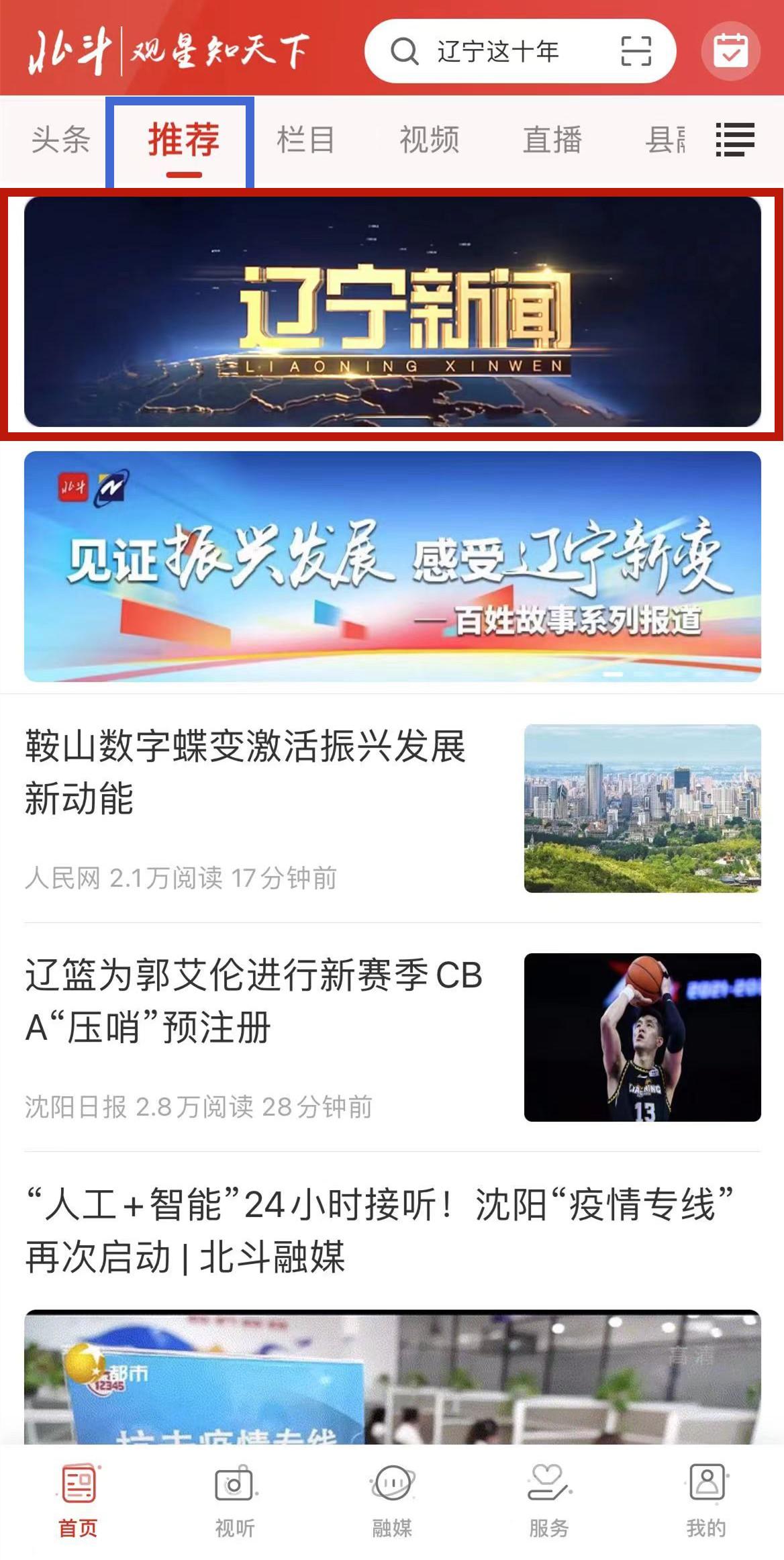 2、上方点击“推荐”版块,进入《辽宁新闻》专区,观看整版节目和拆条新闻