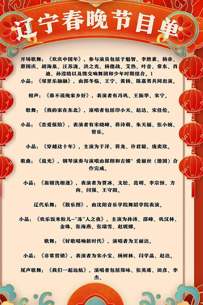 2024年1月18日,以“龙腾万里 兴旺发达”为主题的2024辽宁电视台春节联欢晚会正式公布,晚会将于2月8日(腊月二十九)19:30在辽宁电视台播出。2024辽宁电视台春节联欢晚会以“龙腾万里 兴旺发达”为主题,将腾飞、昂扬的寓意融入振兴、兴旺发达的场景中,也预示着辽宁人民在新的一年里乘着巨龙腾空之势,大步前进、砥砺前行。